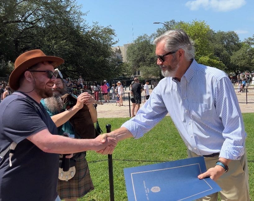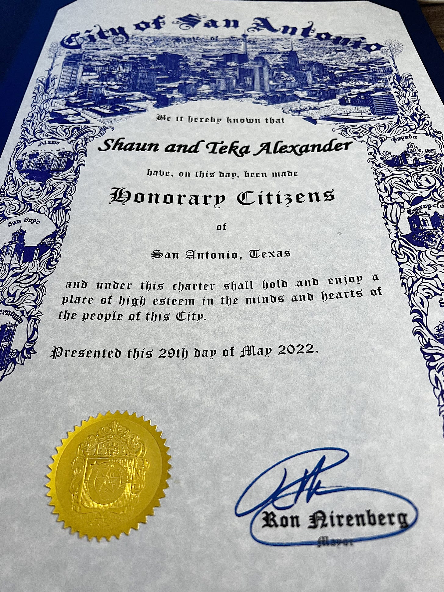 I don’t want to give away spoilers as I’ll be covering all of this in my vlogs, but I want to give a special mention to Peggy and her husband Eddie from the Scottish Society of San Antonio for arranging something truly amazing. They, along with the Viscount Dunrossil Lord Andrew Morrison (also the Chieftain of the Clan Morrison), had arranged for my wife and I to be presented with an honorary citizenship, signed by Mayor Ron Nirenberg, before we were given a private tour of the Alamo.